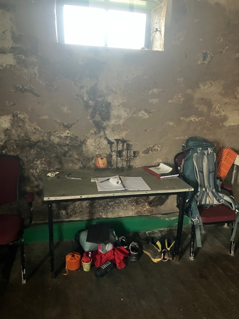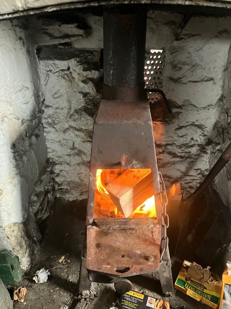 We’d all carried a bundle of logs each and soon had the place warmed up. Once the fire was going, we also cooked a hot lunch and warmed hands on hot chocolate.