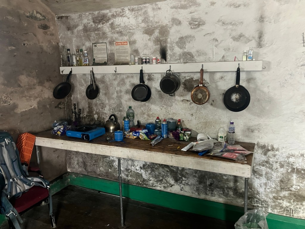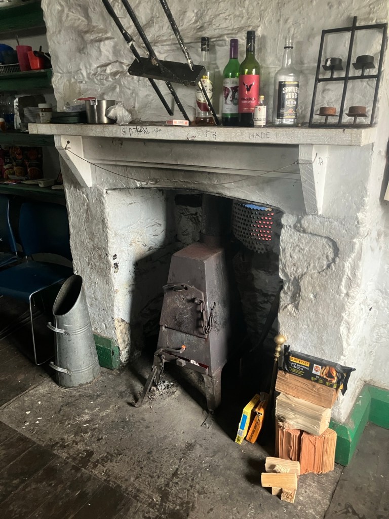There’s a bit of a ‘damp’ vibe inside on first arrival, but it was soon made cosy enough to enjoy the place. Before we departed, we took a few bags of rubbish away and left a pile of dry logs for the next visitors to enjoy, then made our way across the snowy and boggy ground back to the bus. A fine day out!