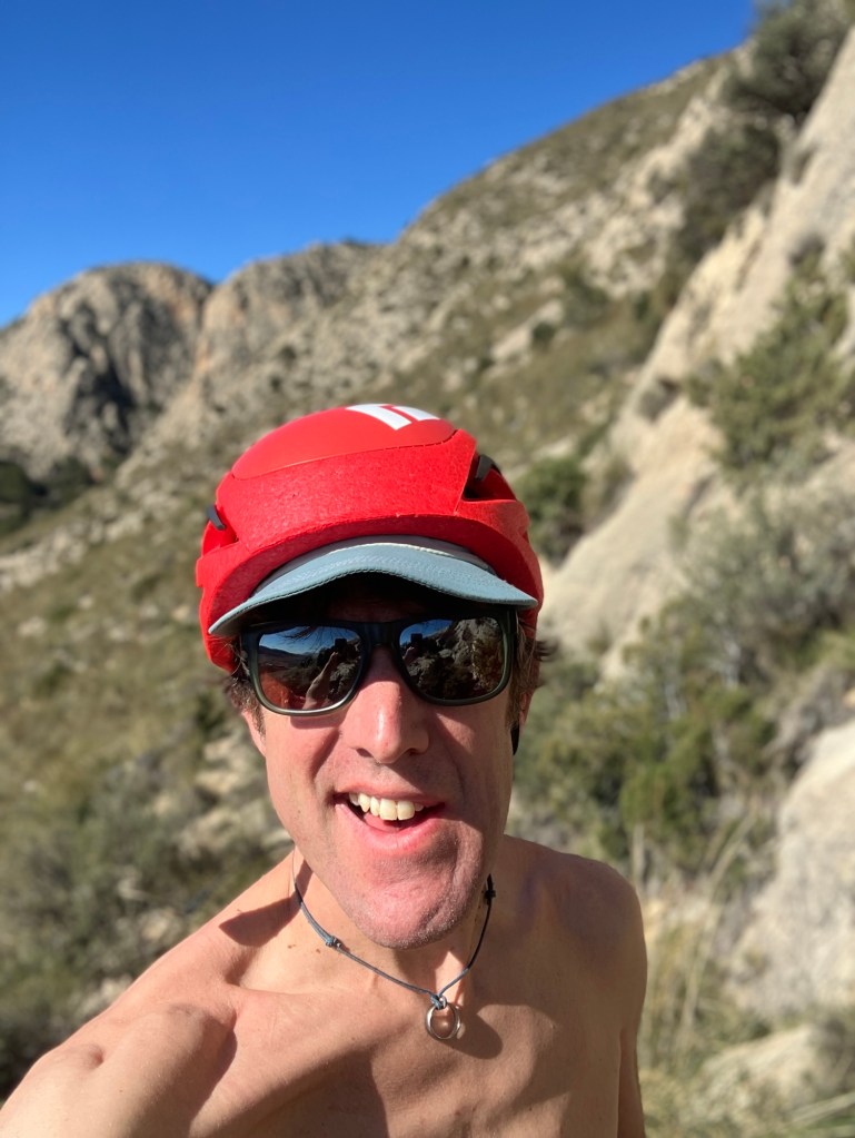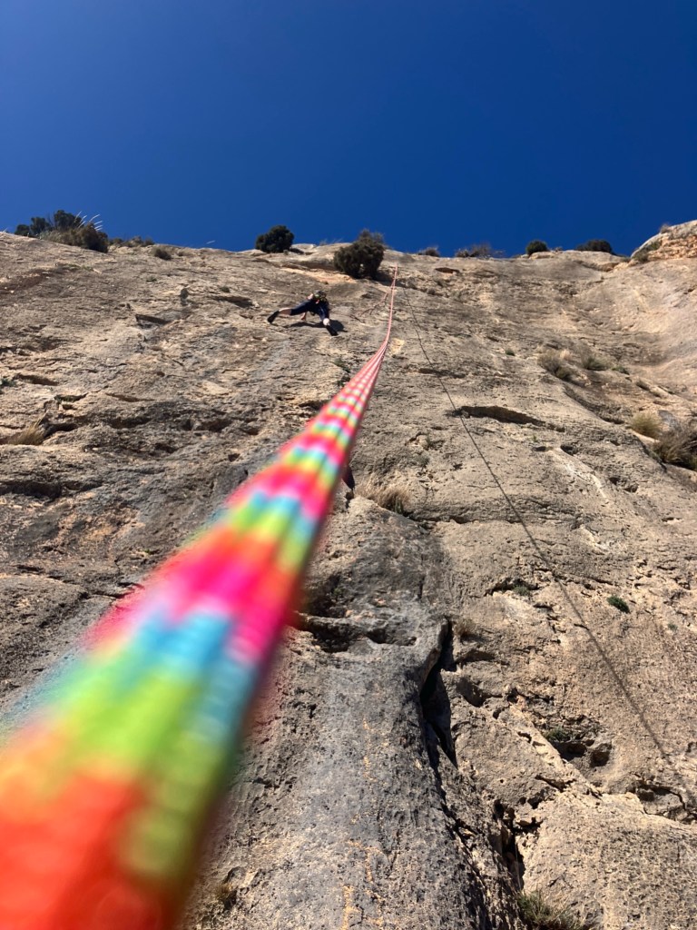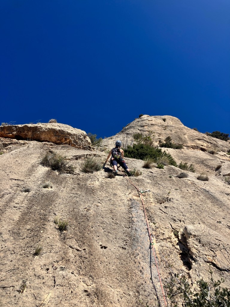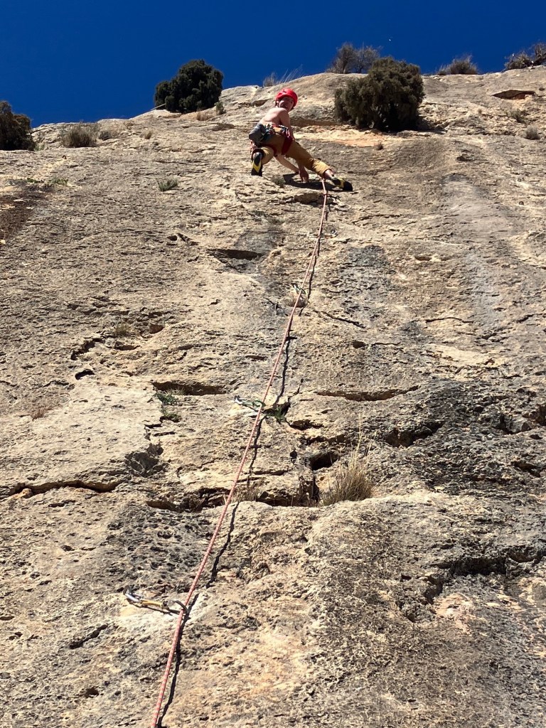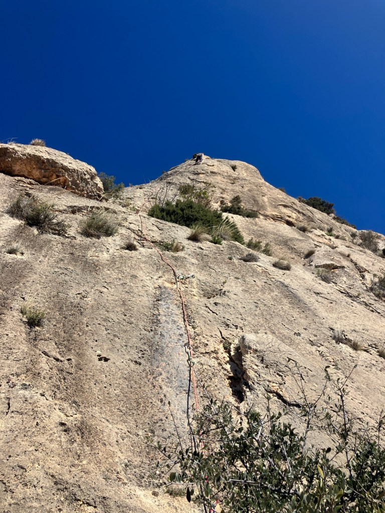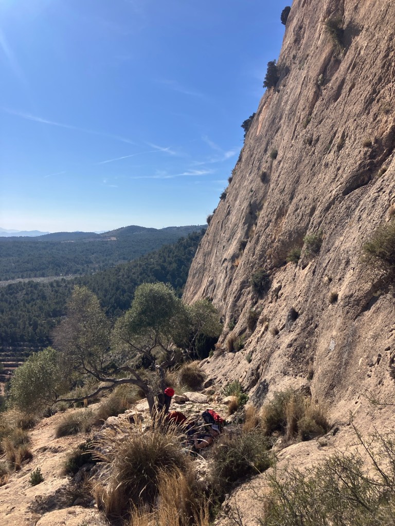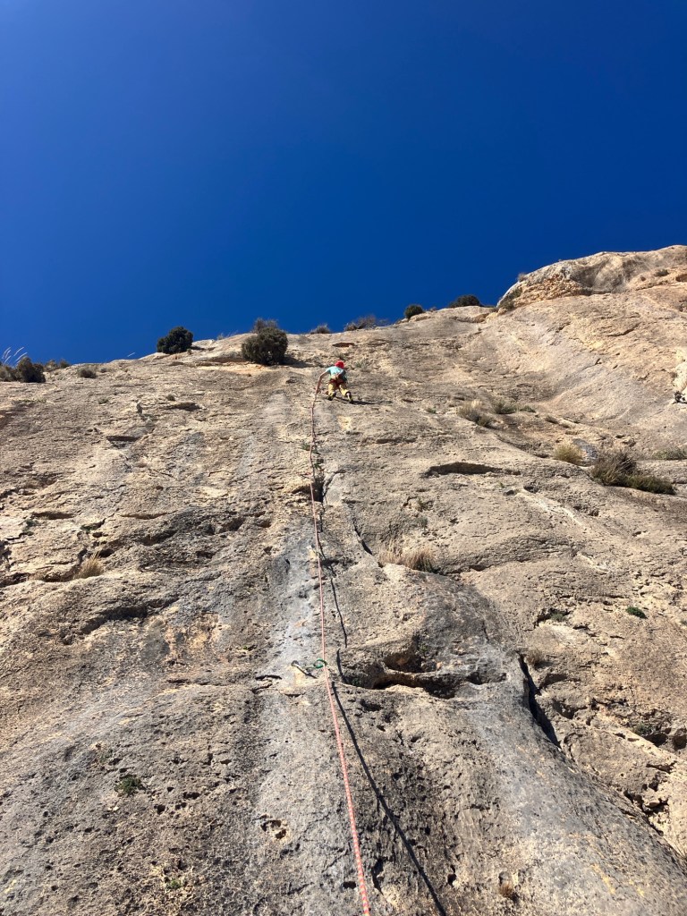 The guidebook said that the cliff at Reconco, faces south, gets all the sun going and there is nowhere to hide from it! It was right! It’s an amazing sweep of steep limestone that’s just off vertical and with tiny pockets and scoops to hang onto. There is one tree (an Olive, not an Almond as the guide says!), which gave us some shade to rest in.