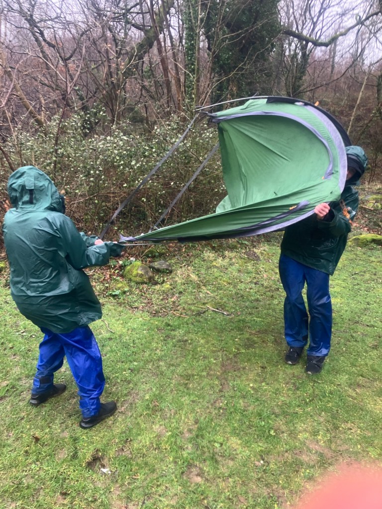 After a week of wearing shorts and sandals, it felt funny to be togged up again in full waterproofs. I’ve been attempting/trying to teach some Duke of Edinburgh’s Award ‘expedition skills’. Things almost got out of hand when the wind really flexed its muscles and sent one of our tents up into a tree! Ha ha! Character building stuff! – At least we were only practicing and didn’t have to sleep out in such conditions…