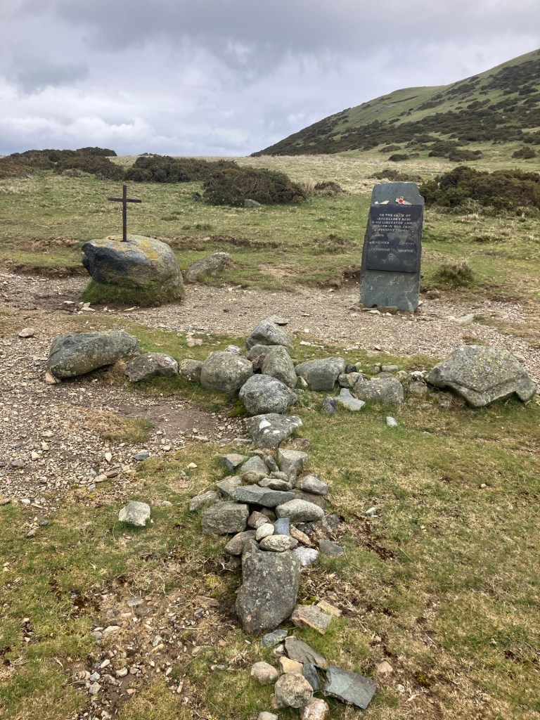 We took a straight line ‘path’ that was more visible on the map than in real life, on the ground, towards the little peak of Moelfre (431m). On the way, we came across a lone memorial to a B24 plane that had crashed here in 1944.