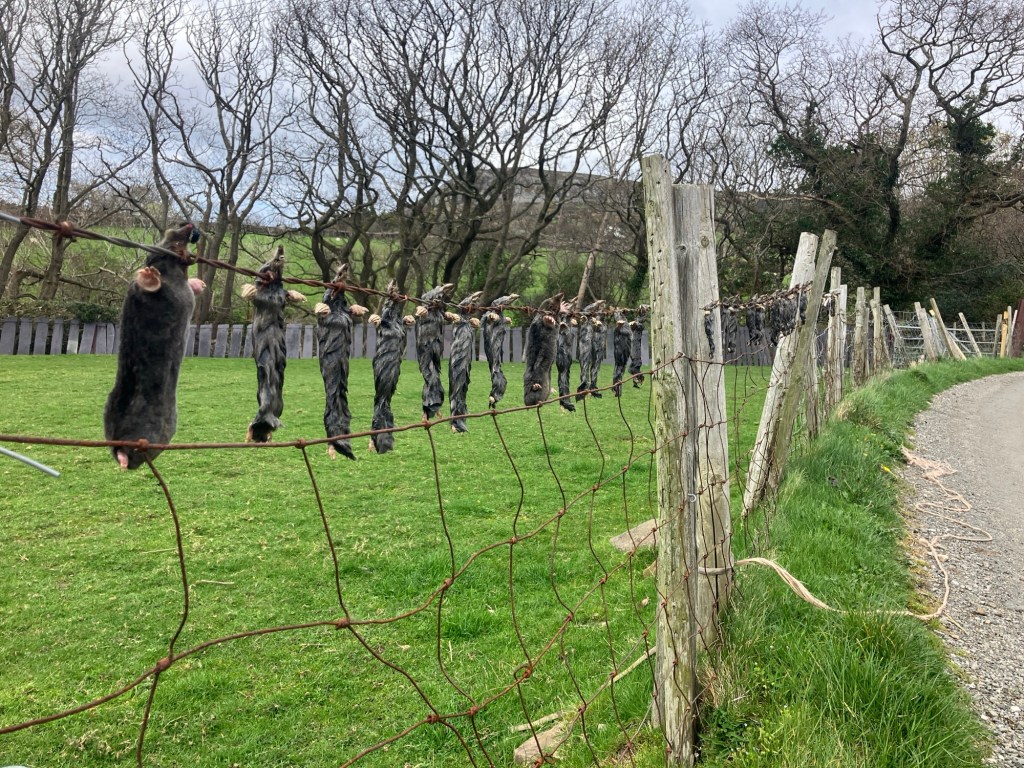 The final section of path was on a much better track that took us through some hill farms as we lost height. There were plenty of fresh lambs doing their frollicking thing, but it seems that Moles are not welcome around here – we passed a fence with 20 or so dead ones, strung out to dry!? Or to warn off other moles? Or perhaps someone was preparing to make a moleskin coat? Who knows… a strange and spooky finish to the trail!
