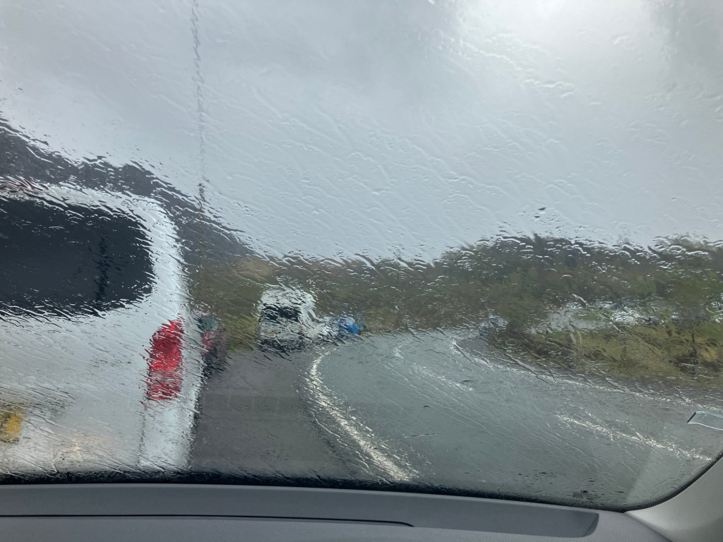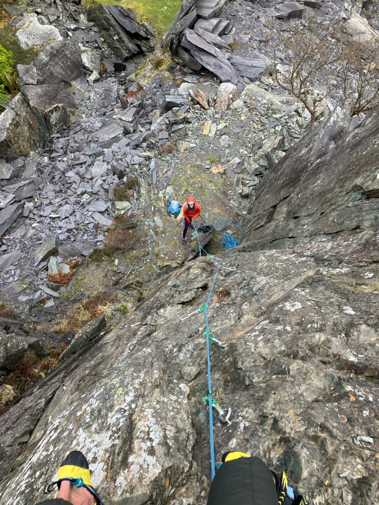 There’s been a light drizzle blowing in on a warm wind all day. We tried to go climbing over at the Llanberis slate quarry in the morning, but turned back half way there as the rain set in properly. Things had ‘sort of’ / almost, dried up in the afternoon, so we tried again after lunch. We weren’t too hopeful and arrived to find our fried Gaz, who’d had the same idea, uncoiling a rope at the base of the route we’d aimed for. A mist was blowing in again and threatening to wet the rock again, so we went quickly up to the top of Bus Stop Quarry, where a few easy routes were just about sheltered.