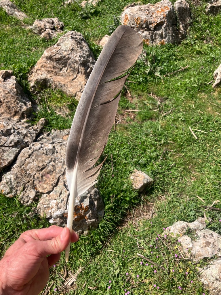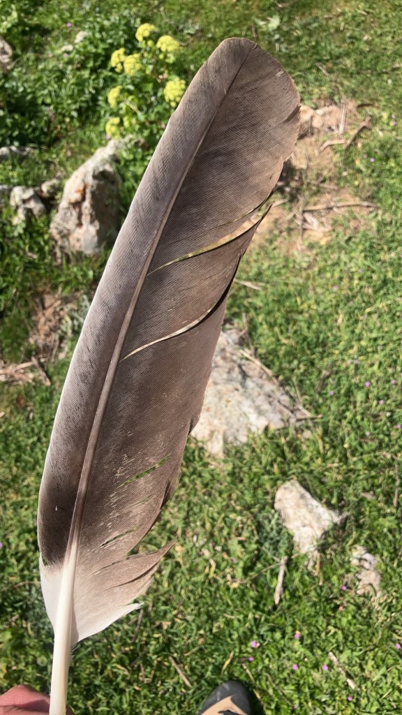 On the walk we came across an enormous feather that my App identified as one from an Eagle! Along with vultures, they glided past all day at eye level. Stunning.